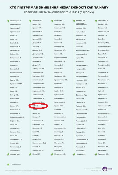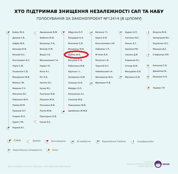 Рух ЧЕСНО, громадська організація, що аналізує голосування депутатів та їхню доброчесність, оприлюднив поіменне голосування від 22 липня 2025 року. Закон, який обмежував повноваження НАБУ та САП, у Верховній Раді підтримали 263 депутати. Серед них — двоє представників Чернігівщини: Валерій Зуб і Валерій Дубіль.