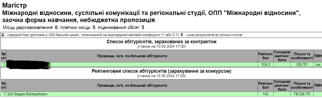 Крім того, співробітник СБУ Вадим Зуб став студентом магістратури Чернівецького національного університету імені Юрія Федьковича за спеціальністю “Міжнародні відносини” у вересні 2024 року. Формально це заочна контрактна програма без жодного бюджетного місця — однак у списках навпроти його імені стоїть позначка “ПЛ”, тобто пільга на навчання. Пільга дає право на безоплатне навчання на контрактній основі, соціальні стипендії, пріоритет при зарахуванні та додаткові гарантії, як-от знижки або звільнення від плати за проживання в гуртожитку.