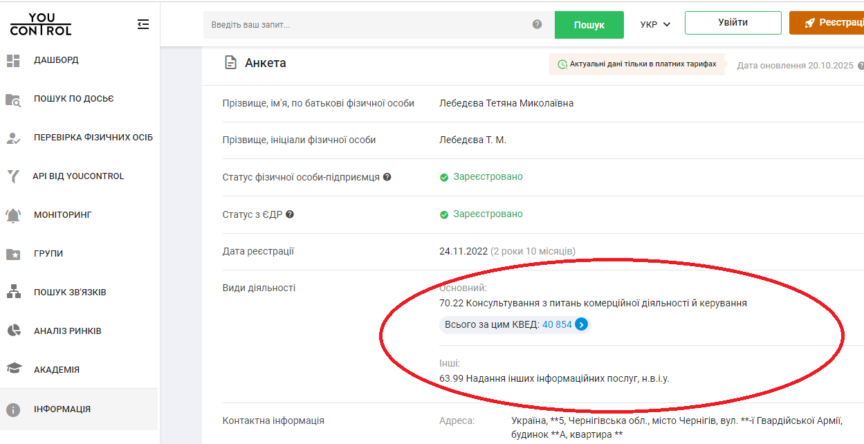 Але зарплата в лікарні — лише одна складова її фінансового портфеля. Декларація також вказує на дохід від підприємницької діяльності — понад 108 тисяч гривень. Пані Тетяна зареєстрована як ФОП у галузях консультування з комерційної діяльності та інформаційних послуг.