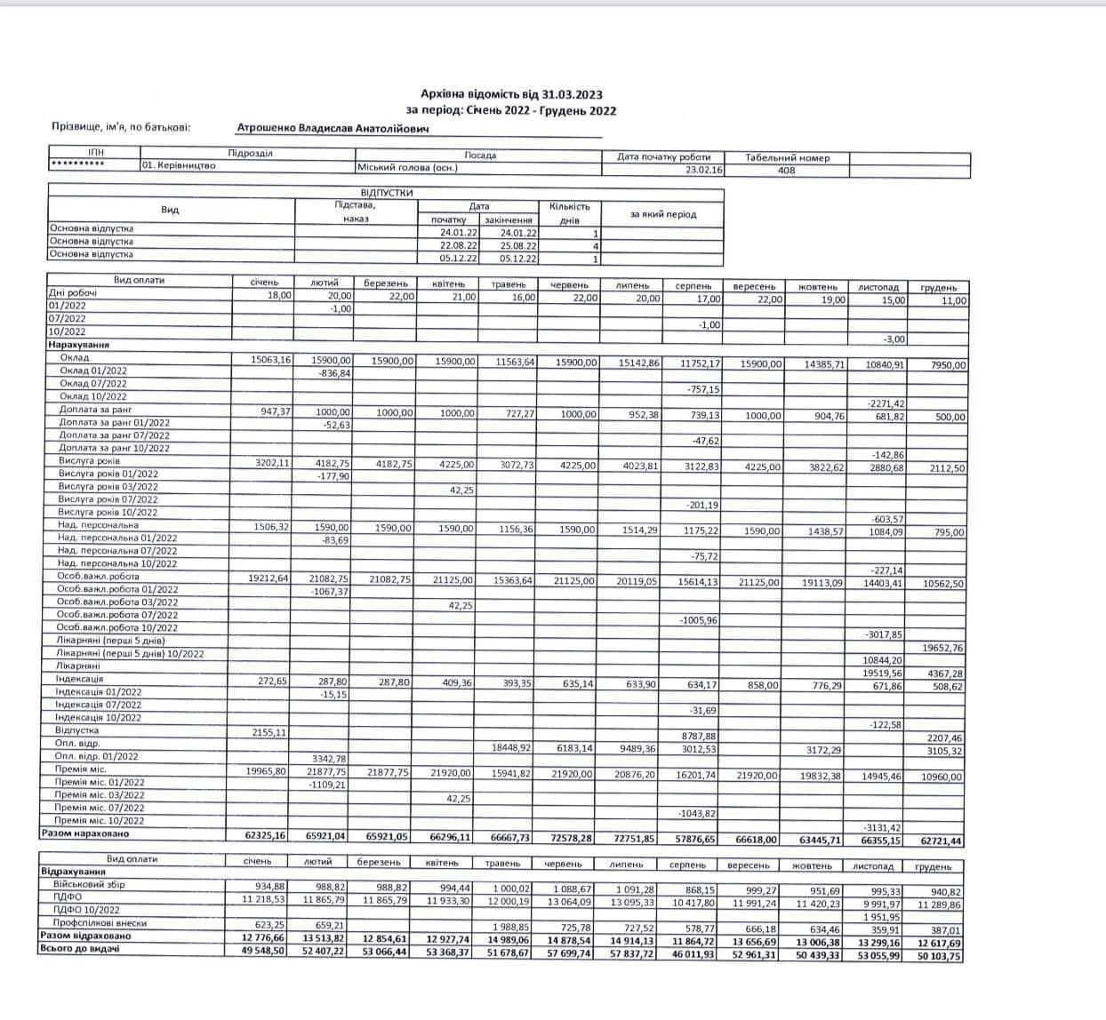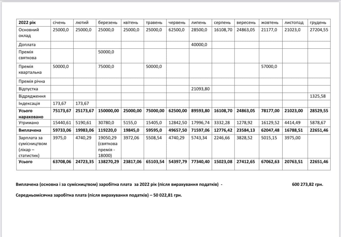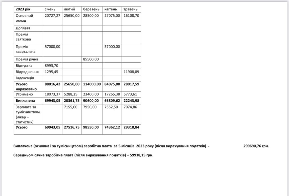 Лише в цьому році генеральний директор Чернігівської міської лікарні №2 одержав 200 000 гривень премії. Упродовж 2021-го року його преміальні виплати склали майже 255 000 гривень, а у 2022-му році він отримав 282 000 гривень. Отже, середньомісячна заробітна плата Кухаря у 2023-му році становить майже 60 000 гривень на руки.