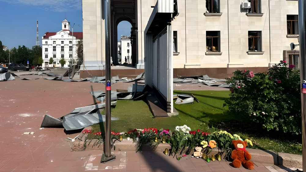 У Чернігові, праворуч від драмтеатру, куди влучила російська ракета та біля якого загинуло семеро чернігівців, а ще 148 отримали поранення, люди стали приносити квіти та іграшки у пам’ять про жертв ракетного удару.