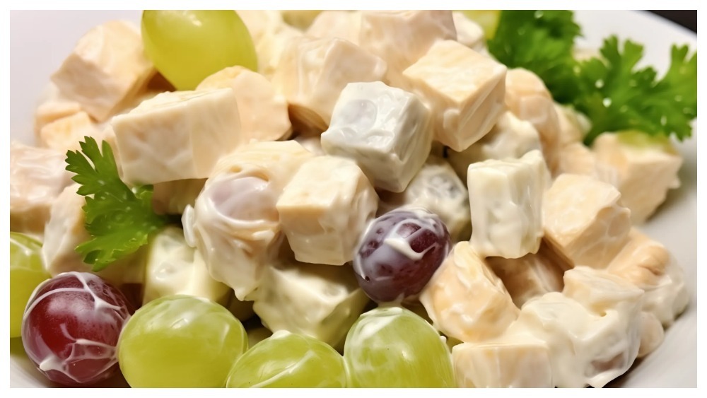 Цей салат поєднує свіжість винограду з насиченістю курячого м’яса та хрусткістю горіхів.